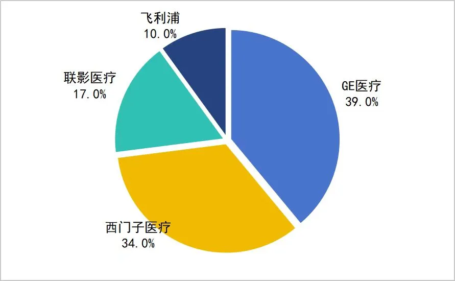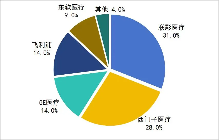 MR主要包括MR(1.5T)和MR(3.0T)兩種。其中,MR(3.0T)以其更高的信噪比、空間分辨率和掃描速度,極大提升了診斷精度,臨床應(yīng)用日益廣泛,占據(jù)MR總體市場(chǎng)超52%的市場(chǎng)份額,且市場(chǎng)份額高度集中,GE醫(yī)療(39%)、西門子醫(yī)療(34%)、聯(lián)影醫(yī)療(17%)三家企業(yè)合計(jì)市占率近90%。聯(lián)影醫(yī)療、東軟醫(yī)療加速入局本次醫(yī)療設(shè)備更新,提升MR國(guó)產(chǎn)化率,其中東軟醫(yī)療以1.5T產(chǎn)品為主,聯(lián)影醫(yī)療在主導(dǎo)1.5T市場(chǎng)份額的基礎(chǔ)上強(qiáng)勢(shì)進(jìn)軍3.0T市場(chǎng)。