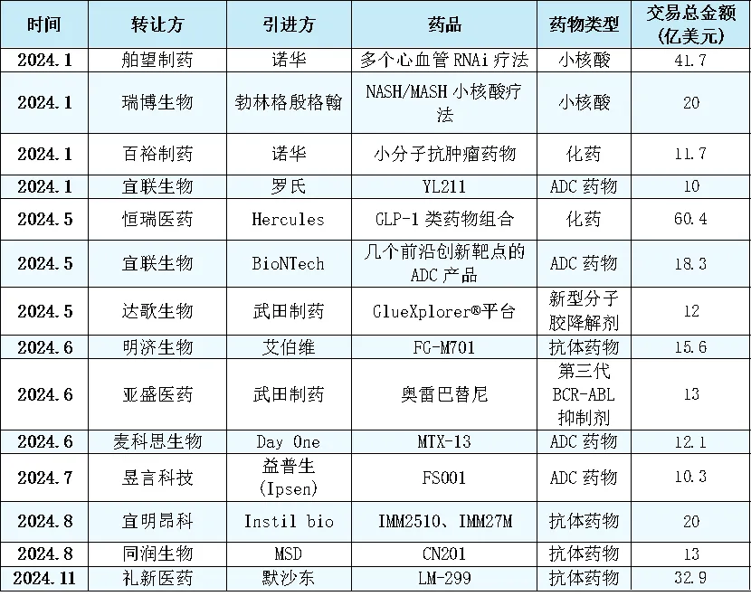 表1 2024年超十億美元出海的國產創新藥榜單